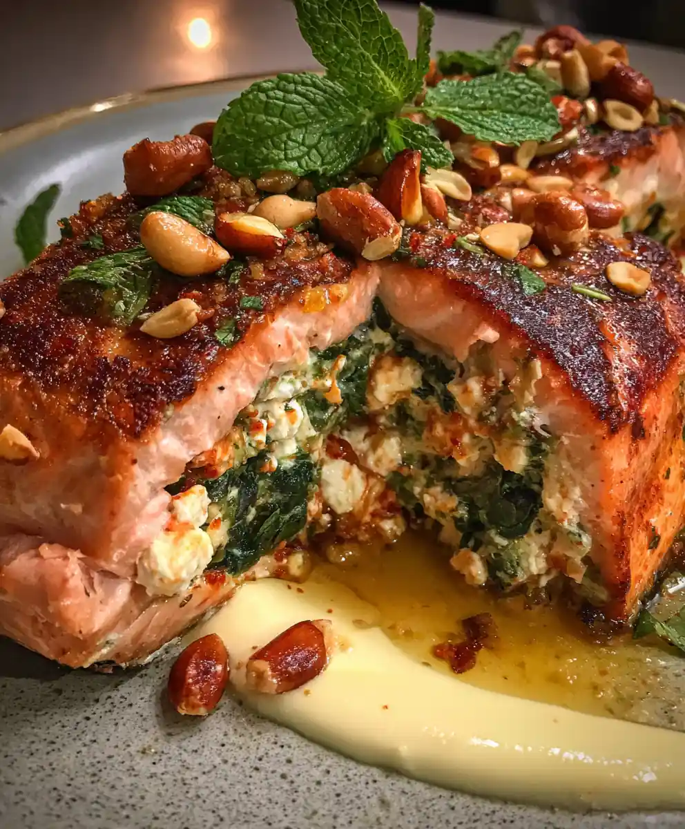 Elevate your stuffed salmon with a sprinkle of fresh dill, a pinch of nutmeg, or sun-dried tomatoes for extra richness. For a seasonal touch, roasted asparagus pairs beautifully in spring, or butternut squash in the fall.