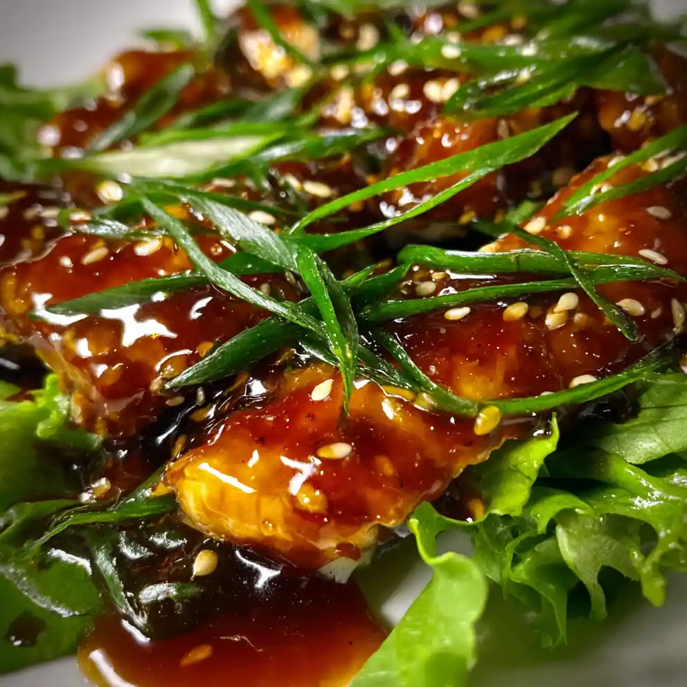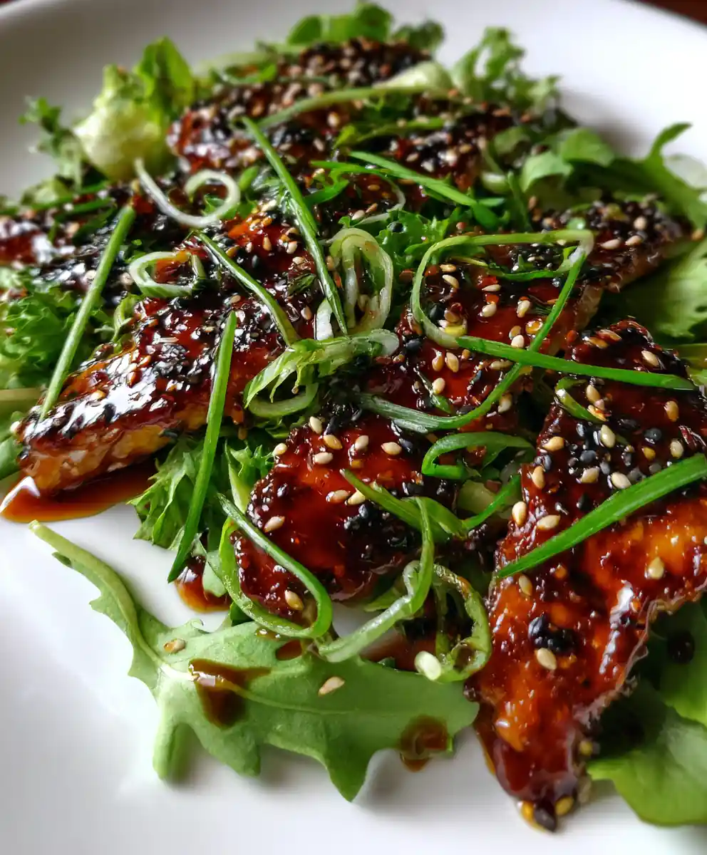 - Dress and Garnish: Drizzle over salad and garnish with green onion and sesame seeds.