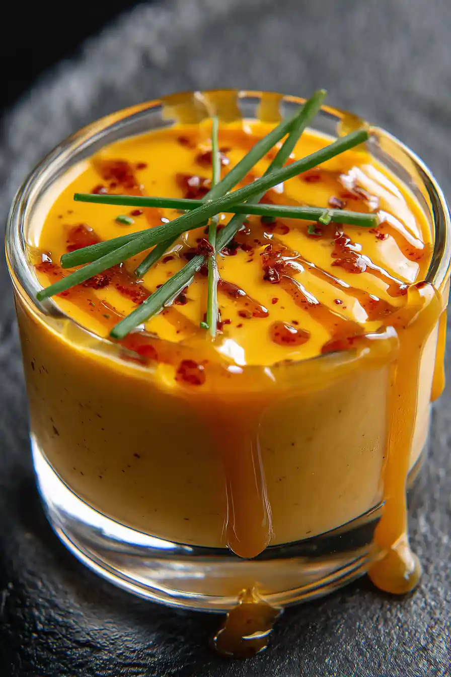 - Plate and Garnish: To serve, spoon the chilled sauce into a small, clear glass ramekin. Place the ramekin on a visually appealing surface, like a matte black stone plate. Drizzle the remaining hot honey in a zig-zag pattern over the top of the sauce for a beautiful contrast. Sprinkle a light pinch of smoked paprika over the honey drizzle for color and a hint of smokiness. Finally, arrange the sliced chive leaves along one side of the ramekin for a fresh, vibrant garnish.