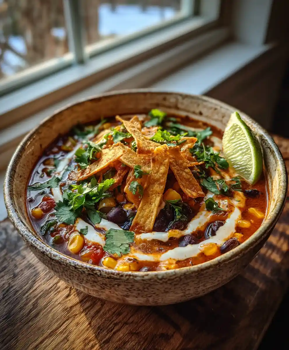 10. Garnish & Serve: Garnish with pumpkin seeds, tortilla strips, and cilantro; serve with lime wedges.