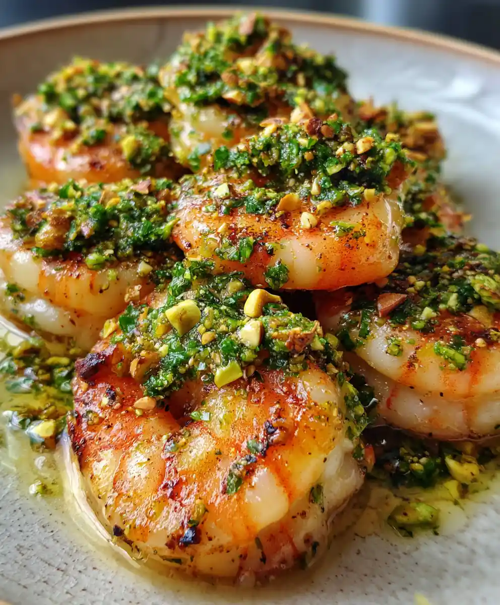 6. Finish Dish: Remove the skillet from heat. Stir in 15 ml fresh lemon juice. Arrange the tiger shrimp on a plate, spooning over the vibrant pistachio-mint gremolata. Finish with a delicate drizzle of remaining 15 ml (1 tablespoon) olive oil.