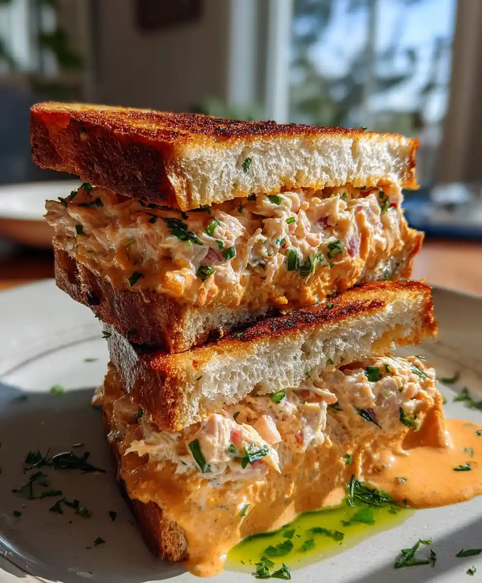 • Step 7: Plate and Serve. Slice each sandwich diagonally to reveal the vibrant red-orange tuna salad interior. Arrange the sandwich halves on a serving plate and generously drizzle the Zesty Herb Drizzle over the cut edges. Garnish with fresh dill sprigs and parsley leaves for a striking visual contrast. This finishing touch makes this particular tuna salad sandwich recipe visually appealing.