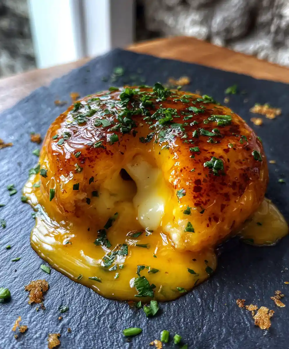 9. Glaze and Garnish: Immediately after removing the cheese bombs from the oven, brush them liberally with the turmeric-garlic butter glaze. The heat from the bombs will help the glaze melt and adhere beautifully. Allow the glaze to pool and create a shiny, appealing finish. Scatter chopped fresh parsley over the glazed bombs for a pop of color and freshness. Finish with a pinch of smoked paprika for a subtle smoky flavor and visual contrast.