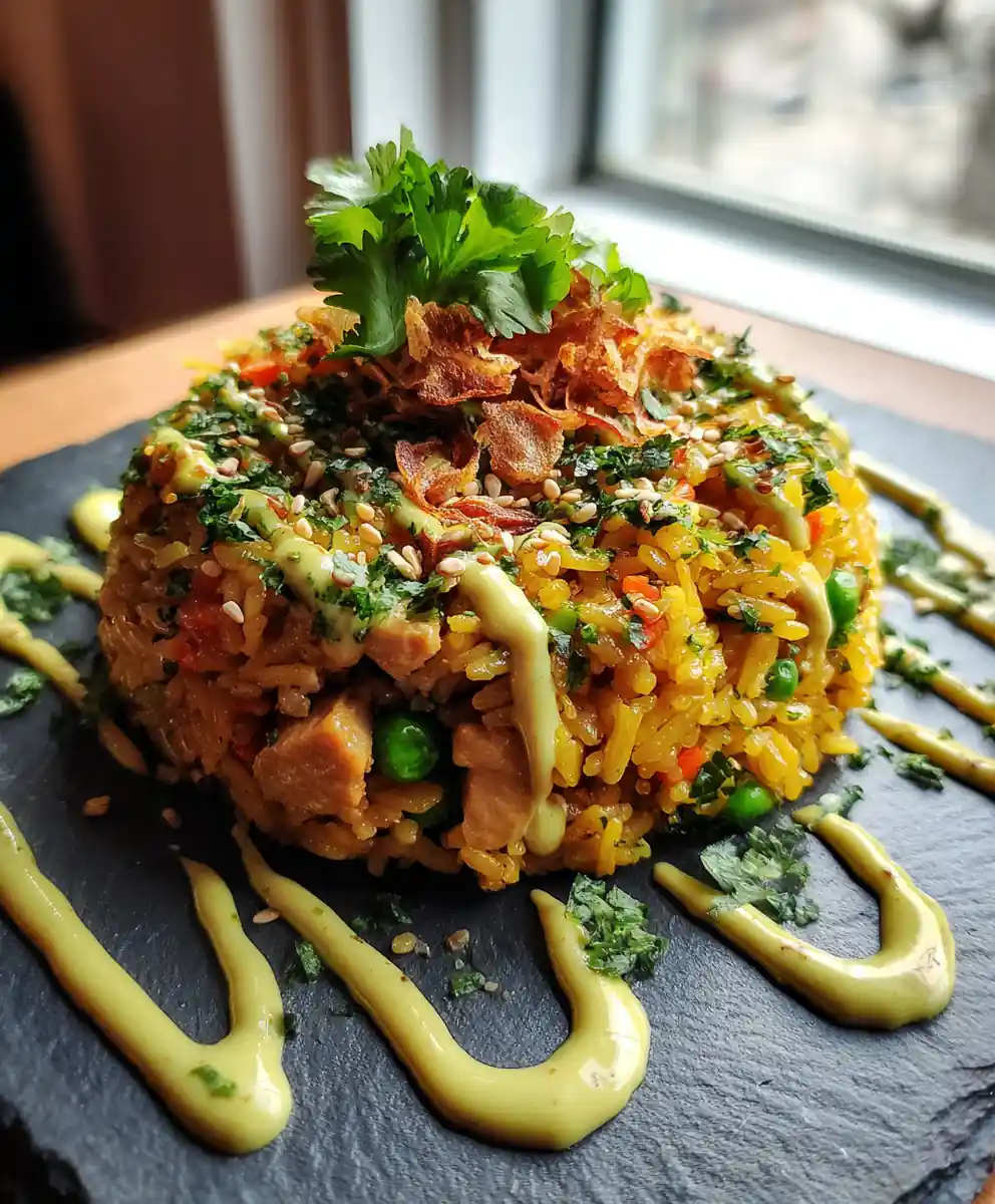 10. Serve Immediately: Serve the Turmeric Gold Chicken Fried Rice immediately while it’s hot and the crema is cool. The contrast in temperature and the vibrant colors make this dish a feast for the senses!