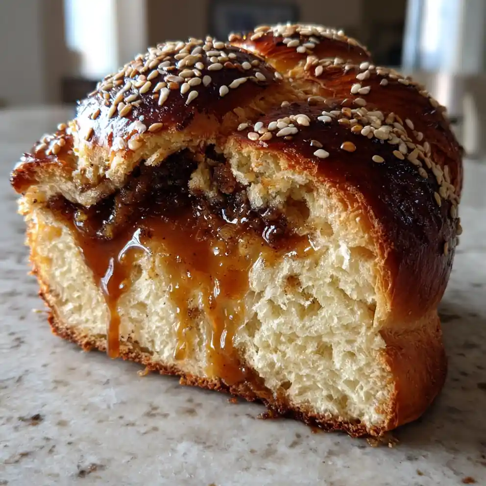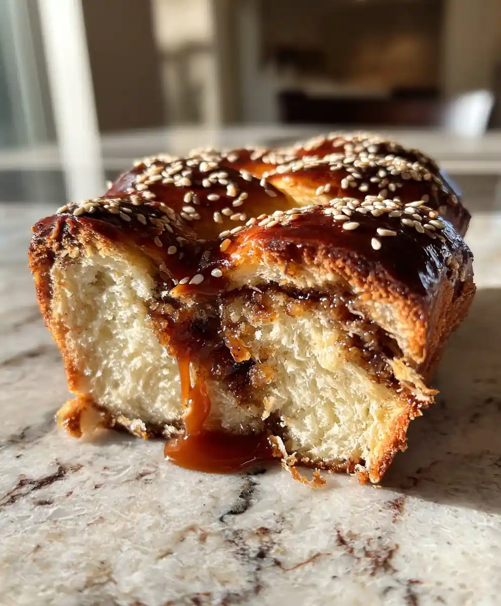 - Glaze and Serve: While challah cools, whisk powdered sugar, reserved 2 tbsp tahini, 1 tbsp plant-based milk, and sesame oil until smooth. Stir in sesame seeds. Drizzle glaze over warm challah and slice to serve warm.
