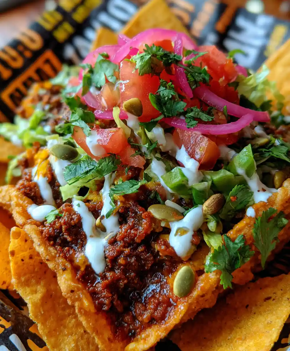 - Assemble Your Walking Tacos: Open each individual bag of corn chips by tearing one long side. Spoon an equal portion of the warm seasoned beef into each chip bag. Top generously with shredded romaine lettuce, diced Roma tomatoes, a spoonful of the vibrant pickled red onions (lightly drained), and a zig-zag drizzle of the smooth lime crema. Finish with a sprinkle of the crunchy toasted pepitas and fresh chopped cilantro. Enjoy immediately.
